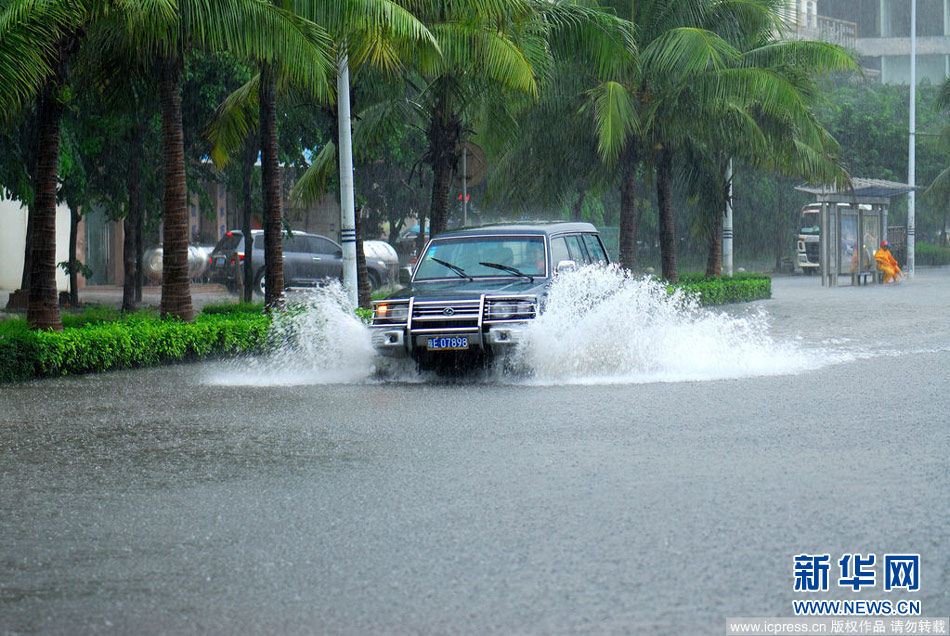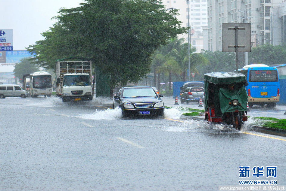 海口部分路段积水严重,车辆在积水中开行,溅起阵阵水花。熊一军