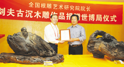 [上海专电] 昨日,来自我市的全国根雕艺术研究院院长郑剑夫将古沉木雕作品《孔子》《善缘》捐赠给上海世博局,这两件国宝级的古沉木根雕将永久性展示于中国馆内供游客品鉴。