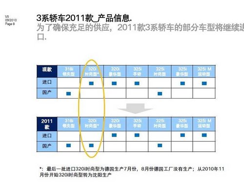 2011款BMW 3系的变化特征之一是在车型的生产方面有了细微的调整,2010款车型中只有318i领先型和325i时尚型由华晨宝马生产。其他车款均由宝马位于德国慕尼黑的组装厂生产,属于标准的“进口车”。