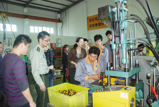 昨日上午,由团市委、安监局和消防大队联合举办的“保平安促生产”青年安全大讲堂活动在市三鼎工具有限公司举行。我市青年安全示范岗争创单位负责人齐聚一堂,就如何做好安全生产及消防安全工作进行交流。图为大家正在参观三鼎公司生产车间。