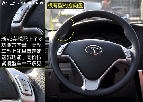V3菱悦的天窗操作方式很有特色,操作开关上有明显的凹凸设计,并且设计位置独立,不用看就可以很方便的进行操作,提高了行车时的安全性。在配置上,风采版标配了天窗和多功能方向盘。而V3菱悦车系中的旗舰版和旗舰导航版天窗均属于选装配置,要额外付出4000元才可以,并且定速巡航功能也只配备在CVT车型上。
