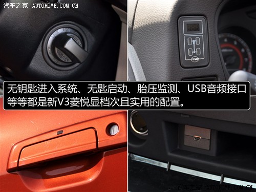 新V3菱悦在很多细节上都做了改进,有视觉效果上的,也有配置方面的,尤其是风采版的变化还要多一些。仪表盘中间加了橙红色的背板,除了装配多功能方向盘和定速巡航,还有胎压监测、无钥匙进入系统、CCD倒车影像、DVD和导航等配置。相比在同价位的紧凑型家用车中配置丰富,表现出高性价比的优势。