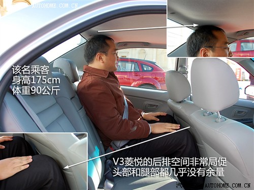 V3菱悦由于采用之前东南菱帅的平台,该车型设计年代较早,所以V3菱悦轴距只有2500mm。对于紧凑型车尺寸不断攀升的今天,这个数字已经没有任何优势了。前排头部空间基本算过得去,而后排头部就显得比较局促,腿部空间的表现也很一般。在空间表现上,V3菱悦确实没有什么亮点。