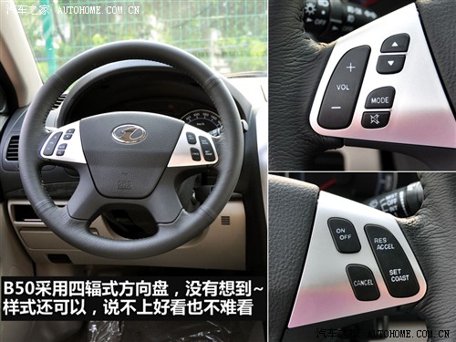 奔腾B50多功能方向盘是全系标配,无论是和B70相比还是与其他同级对手相比都算的上厚道,只是这个方向盘的喇叭的区域稍微有点小,按喇叭的时候手需要离开方向盘外圈,不是很方便。多功能方向盘在功能上很丰富,可以进行音响的多种操作,包括模式选择、音量控制、设定台选择以及一键静音功能一应俱全,而且全系配有定速巡航功能。