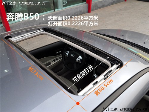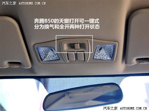 奔腾B50除了豪华型以外均配备了电动天窗,天窗打开可一键式,分为换气和打开两种状态。但是B50天窗的两种状态是通过两组按钮来进行操作的,使用时多少还是带来了一些不便。