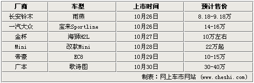 在上面的统计表可以看出,主打运动范的2011款雨燕和宝来Sportline将于26日上市,而金杯海狮H2L则是借金杯系列车型100万下线之际推出。而小改款Mini车型将于28日上市,同时Mini one将推出1.4L车型,预计售价22万元起。另外帝豪EC8和广本歌诗图两款全新车型,将于29日和30日上市销售。