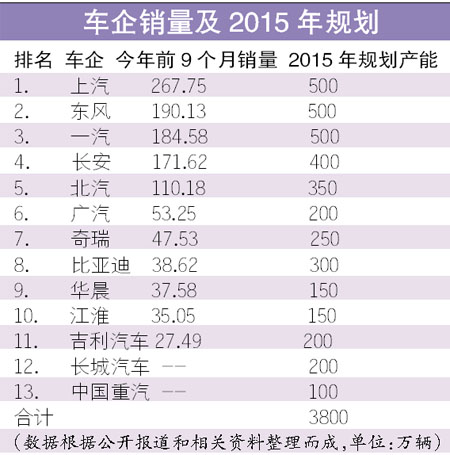 近期,国内整车企业纷纷制定雄心勃勃的产能规划,到“十二五”规划最后一年的2015年,仅从已经统计的汽车集团的信息来看,已经达到3800万辆,加上未统计在内的(如福建汽车集团、众泰汽车、陕西汽车等),总体规划产能在4000万辆,远超过中国汽车工业协会、工信部乐观估计的3000万辆。