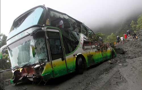 10月23日,台湾宜兰,苏花公路被挖出的游览车支离破碎。