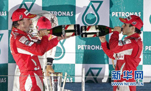 10月24日,法拉利车队车手阿隆索(左)与队友马萨在颁奖仪式上对饮香槟庆贺胜利。当日,在F1韩国大奖赛上,效力于法拉利车队的西班牙车手阿隆索夺得冠军,另一名法拉利车队车手马萨获得第三名。新华社/路透