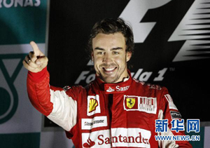 10月24日,法拉利车队车手阿隆索在颁奖仪式上庆祝。当日,在F1韩国大奖赛上,效力于法拉利车队的西班牙车手阿隆索夺得冠军。新华社/路透