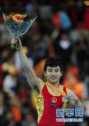 10月24日,中国选手冯喆在颁奖仪式上。当天,在荷兰鹿特丹举行的第42届体操世界锦标赛中,冯喆获得男子双杠冠军。 新华社记者曾毅摄