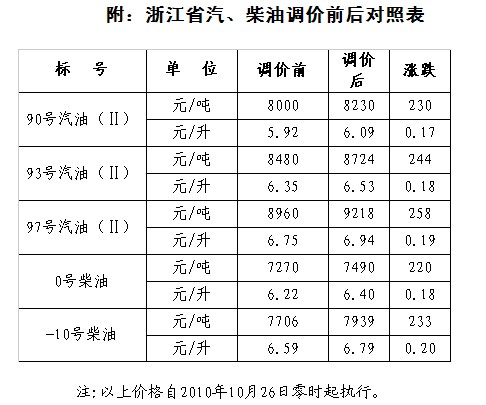 浙江在线杭州10月25日讯(记者 廖小清)25日晚,浙江省物价局下发关于提高成品油价格的通知。从10月26日零时起,全省汽、柴油(标准品)最高零售价格每吨分别提高230元、220元。