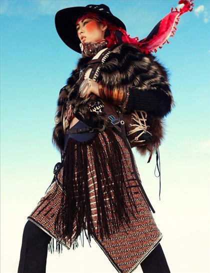 中国超模刘雯演绎了《Vogue》德国版2010年11月号大片。在摄影师Greg Kadel的镜头下,诉说了一个游牧民族的传奇。碧天下黄沙弥漫,但却依然星光四射。从大号珠宝到动物皮草,刘雯俨然秋日狂野中的一轮骄阳。
