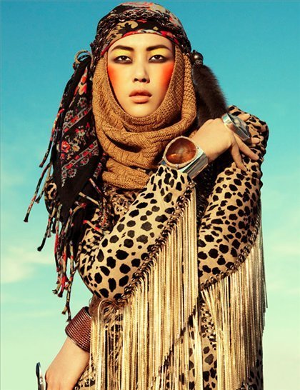 中国超模刘雯演绎了《Vogue》德国版2010年11月号大片。在摄影师Greg Kadel的镜头下,诉说了一个游牧民族的传奇。碧天下黄沙弥漫,但却依然星光四射。从大号珠宝到动物皮草,刘雯俨然秋日狂野中的一轮骄阳。