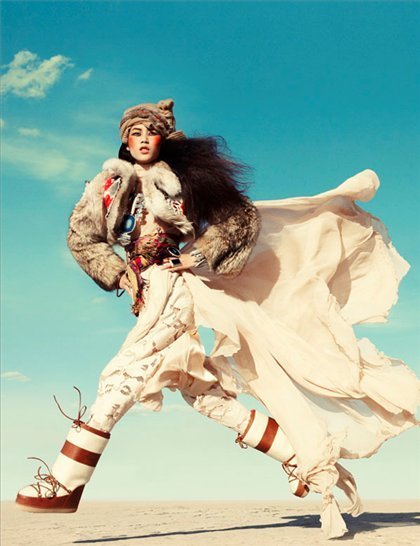中国超模刘雯演绎了《Vogue》德国版2010年11月号大片。在摄影师Greg Kadel的镜头下,诉说了一个游牧民族的传奇。碧天下黄沙弥漫,但却依然星光四射。从大号珠宝到动物皮草,刘雯俨然秋日狂野中的一轮骄阳。