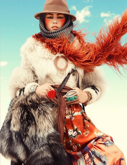 中国超模刘雯演绎了《Vogue》德国版2010年11月号大片。在摄影师Greg Kadel的镜头下,诉说了一个游牧民族的传奇。碧天下黄沙弥漫,但却依然星光四射。从大号珠宝到动物皮草,刘雯俨然秋日狂野中的一轮骄阳。