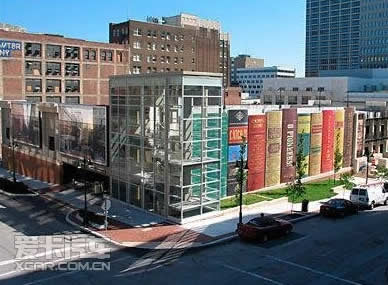 由本地读者提名最喜爱的书籍,并用它们来装饰这个车库的整面,让这里成为了堪萨斯城的一个标志。这个有独特建筑风格的建筑是由22本古典文学的书脊作为墙面,书与书之间夹着金属楼梯井。车库在前面的中间位置,带领读者进入图书馆。