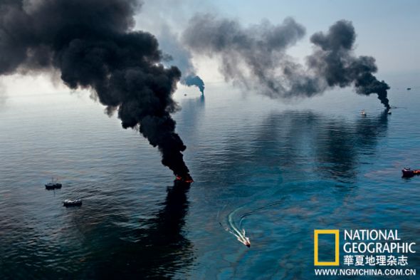 在“深水地平线”井喷现场附近,清污人员焚烧浮油带来滚滚浓烟。油井喷出了近500万桶原油,这使它在海洋油井漏油事故中成为世界第一。