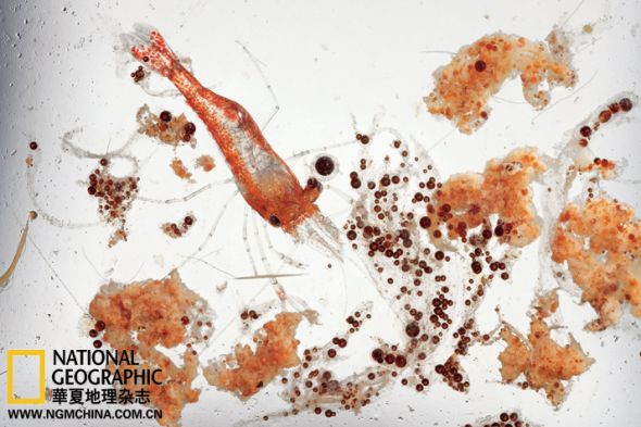 一只订书钉大小的虾在深棕色的油珠中游动。这次漏油事件对于虾、蟹和鱼的卵和幼虫的影响还不得而知,这些动物是当地经济的支柱。