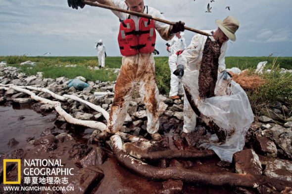 路易斯安那州巴拉塔里亚湾附近一处海鸟筑巢地,工人正把吸收油污的绒球装进袋子,吸油索像蛇一样绕在他们脚下。