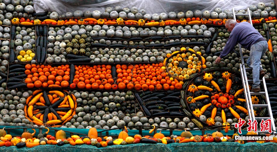 万圣节到来的前夕,英国斯林登老农托尼·史密斯将自己种植数百只南瓜堆成牵引机车的模型。