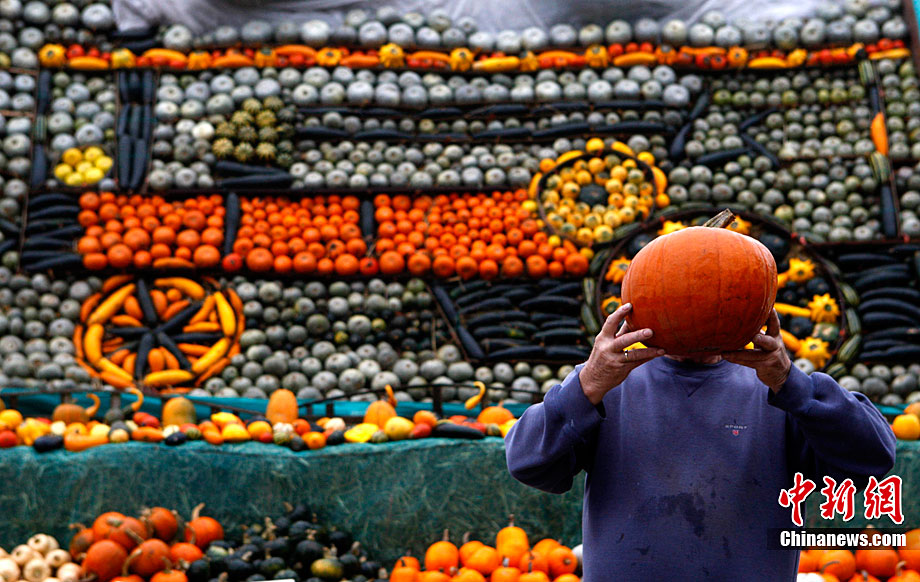 万圣节到来的前夕,英国斯林登老农托尼·史密斯将自己种植数百只南瓜堆成牵引机车的模型。