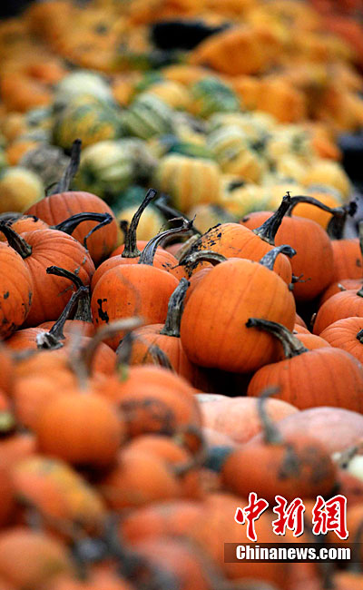 万圣节到来的前夕,英国斯林登老农托尼·史密斯将自己种植数百只南瓜堆成牵引机车的模型。