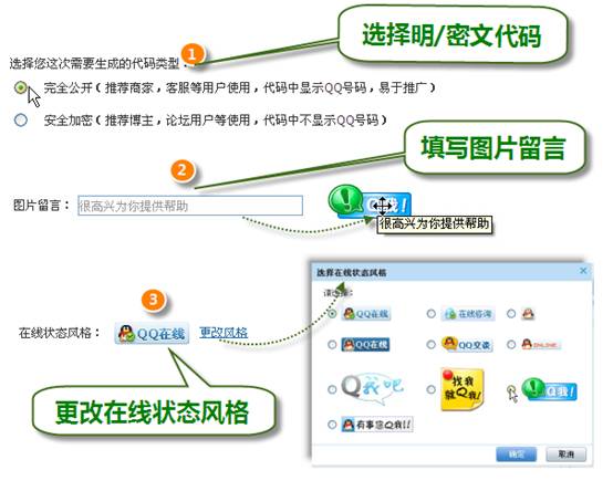 进入"QQ在线状态"的官方网页后,在"选择代码类型"里选择需要生成的代码类型。目前系统提供了完全公开和安全加密两种代码类型,前者适用于商家网站推广、客服等用户,代码中将显示QQ号码,易于推广,而安全加密则比较适合博主,论坛用户使用,代码中不会显示QQ号码。完成代码类型选择后,我们还可以自定义"QQ在线"的图标风格和留言。(图1)