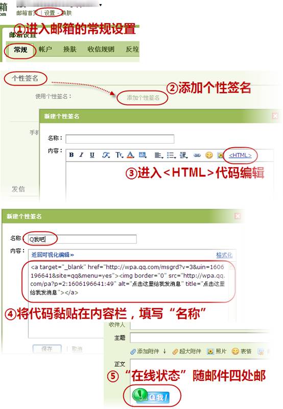 以QQ邮箱为例,"QQ在线状态"一般加载在邮件的个性签名中。在邮箱"设置"的常规选项里,找到"个性签名"后,点击"添加个性签名"。切换到HTML编辑页面时,会产生一段默认代码。我们只需将生成的代码替换成之前在官网上生成的明文或者密文代码,点击保存即可。保存后,邮件中就会出现我们的"QQ在线状态",只要收到邮件的网友,都可以随时和发件人进行即时沟通联系。(图4)