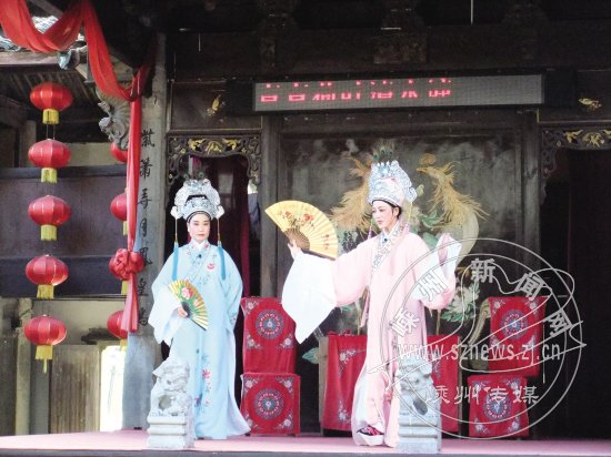 在中国女子越剧发源地——甘霖镇施家岙村,有一个群众性越剧文体团队“娘家戏班”,为游客送上原汁原味的早期越剧剧目(如图)。“娘家戏班”演员基本由本地的越剧爱好者组成,组建以来共为游客演出近千场次,累计接待游客10余万人次。近年来,施家岙村充分利用越剧和旅游两张“金名片”,走出了一条“以文化带动旅游,以旅游促进经济,以经济反哺文化”的发展之路。