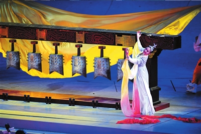 单个重达40公斤的编钟出现在舞台上。