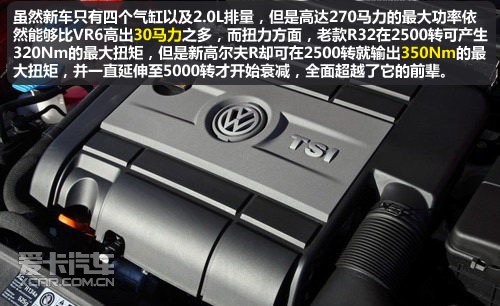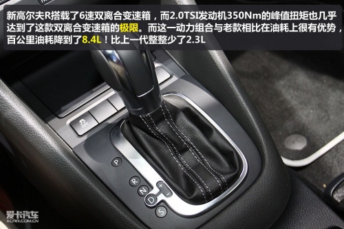 新高尔夫R搭载了那款熟悉的6速双离合变速箱,而2.0TSI发动机350Nm的峰值扭矩输出也几乎达到了这款变速箱的极限。除了动力上的出色表现挖,这一动力组合与R32相比在油耗上也很有优势,百公里油耗降到了8.4L,比R32整整少了2.3L。