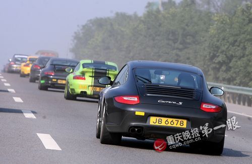 一辆黑色保时捷GT3RS,两个人同行。驾驶员一件黑色紧身亮皮夹克,头发后梳,一脸酷相。坐在副驾驶位置的余先生说,他们这辆车价值300多万元,是这次车队最贵的车型之一,车主就是身穿黑色夹克的酷哥。