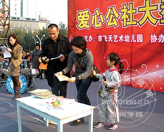 买方,卖方。买卖双方都笑容可掬。10月31日下午,由嵊州市飞天艺术幼儿园和嵊州传媒爱心公社联合举办的爱心物品大拍卖正在文化广场热情上演。幼儿园学生,家长,老师,爱心市民,里三层外三层将小朋友的爱心摊位挤得满满当当。爱心摊位都有一个好听的名字:爱心量贩屋,爱心驿站,爱心宝贝商铺,烨烨淘宝店……当然啦,最大的商铺叫爱心公社大型广场义卖。在广场中间,门楣上画一颗鲜艳的爱心。
