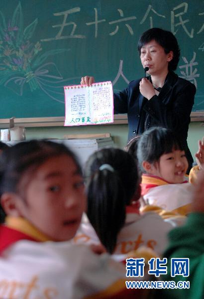 10月26日,新疆乌鲁木齐第三小学三年级的老师在向孩子们讲解人口普查常识。当日,新疆乌鲁木齐第三小学的孩子们通过学校人口普查宣传员的讲解,并根据自己的了解制作了数百张以人口普查知识为主题的手抄报,向家长和身边的亲友宣传人口普查知识。新华社记者 江文耀 摄