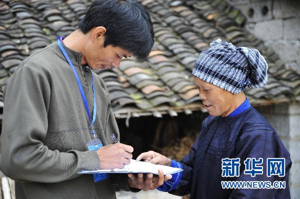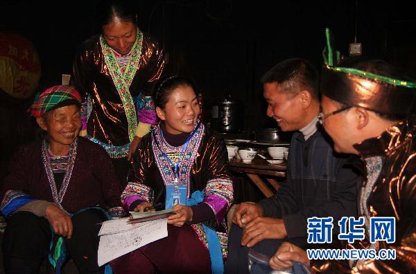 11月1日,在与越南毗邻的广西靖西县龙邦镇其龙村,普查员在壮族群众家中进行查访登记。当日,第六次全国人口普查全面展开,全国600多万名普查员和普查指导员将走进4亿多户住户,查清查实全国人口状况。 新华社发(赵京武 摄)