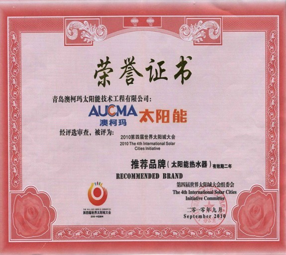 2010年9月,第四届世界太阳能大会在中国山东省德州市召开,云集了各国政要、行业专家、企业精英3000余人,大会就城市新能源开发利用、可循环能源技术、低碳排放建筑、太阳能热利用应用与发展等进行了研讨,倍受全球关注。此次太阳城大会首次推出“推荐品牌”评选活动,经过企业实力调查、市场销售调查、产品质量调查、售后服务调查、信用调查等层层审查,推选出太阳能热水器品牌5个,出口品牌3个,工程品牌3个,其它项1个。凭借优秀的企业综合实力,“澳柯玛”太阳能热水器成功入选“世界太阳城大会推荐品牌”!