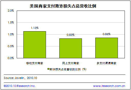 艾瑞咨询根据Javelin Strategy & Research发布的对美国1006名商家的调查数据发现,支持移动支付的商家中欺诈造成的损失占总营收的1.13%,而在只采用网上支付及多支付渠道的商家中这一比例分别为0.83%和0.86%。