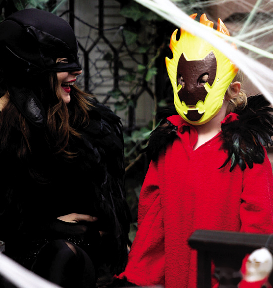 为了庆祝万圣节,丽芙·泰勒和她的儿子Milo Langdon将房子周围装扮得很有节日气氛,看起来像被蜘蛛网笼罩一样。泰勒戴着普通的黑色面具,而Langdon的黄色面具很抢眼,颇似孙悟空造型。