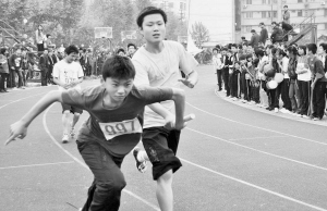 图为10月29日,嵊州的中学学生们正在进行400米接力决赛。(张亮宗 袁增初 摄)