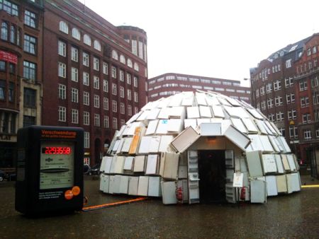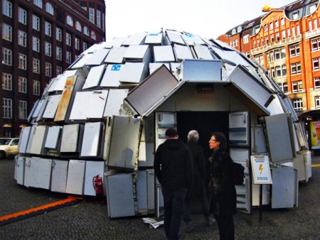 许多使用时间很久的冰箱或许看起来并不破旧,但是因为制造技术更新换代迅速,当初制造冰箱的技术早已落后,旧冰箱比新冰箱使用起来要多耗费许多能量。在德国汉堡市市中心,一位艺术家用322个旧冰箱“盖”出了这个独特的“冰箱圆顶屋”。为了告诉人们这些旧冰箱耗能巨大,屋外特别连接了一个巨型的电表,红色的大字醒目地向人们展示了高额的能耗,以此提醒人们保护地球、科学节能。