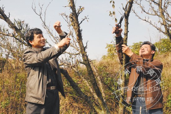 连日来,在金庭镇的桃形李基地,不少果农正忙着修剪整形和施肥,对桃形李进行精心护理,为明年桃形李的高产打下扎实的基础。图为金庭镇灵鹅村果农正在修剪桃形李枝头。