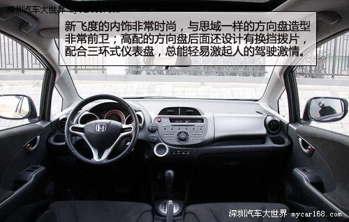 新飞度的内饰不仅如外观一样时尚,同时还非常有科技感:与思域一样的方向盘造型非常前卫;高配的方向盘后面还设计有换挡拨片,配合三环式仪表盘,总能轻易激起人的驾驶激情;别致的中控面板巧妙地将各种功能区分开,并用两个小液晶屏分别显示着空调与音响状态。这些时尚而带有几分科幻色彩的设计组合在一起,让人有进入太空舱的错觉。