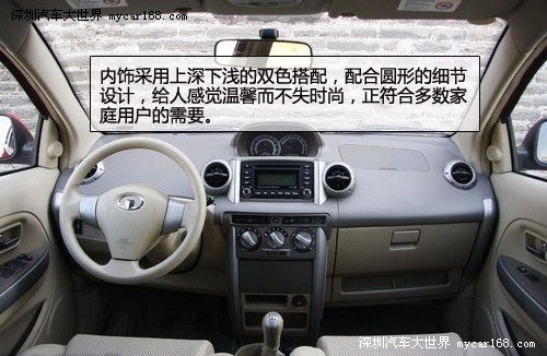 内饰采用上深下浅的双色搭配,配合圆形的细节设计,给人感觉温馨而不失时尚,正符合多数家庭用户的需要。中置仪表盘的设计让人不由得联想起丰田的NBC平台,简洁的旋钮设计使得上手变得很简单,但在实用功能上却是一点也没有精简。材质方面属于五六万元车应有的水平,手感生硬但好在装配做工扎实,并没有松垮的感觉。