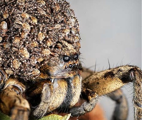 雌性狼蛛对小狼蛛的照顾可谓无微不至。雌性狼蛛再产卵前先用蛛丝铺设产褥,将卵产上后又用蛛丝覆盖,做成一个外包“厚丝缎”,内铺“软丝被”的卵囊,以防风避雨。为了防止意外,狼蛛干脆把卵囊带在腹部下面,用长长的步足夹着它随身带走。小狼蛛出世后,雌蛛更是爱护备至。幼儿纷纷爬上母亲的背部或腹壁,由母亲背着到处巡游、狩猎。这样,要持续到幼蛛第二次蜕皮后,雌蛛才肯放心地让它们离开自己,各自谋生。