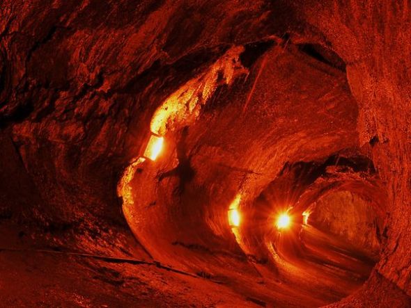 灯光照亮了美国夏威夷火山国家公园的瑟斯顿熔岩洞。熔岩洞的作用就像是一个底下管道,使熔岩从火山下面流到远处。