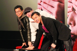 王中军(右)与王中磊(左)一起按着冯小刚的手,按下手印。
