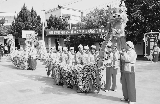 11月4日,绍兴市农村文明建设现场会在嵊州市举行。与会人员专程赴甘霖镇黄箭坂村、长乐镇福全村和上南庄村,参观村级精神文化建设成果。图为黄箭坂村的舞龙表演。 (记者 张亮宗 摄)