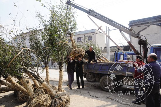 今年全市花木小苗销售形势看好,平均每亩收入可达五六万元,比往年提高了200%。日前,金庭镇灵鹅村花木大户王化正将一批“睡姿海棠”装运上车,准备运往上海浦东野生动物园边的别墅区。图为工人们正在装运海棠。