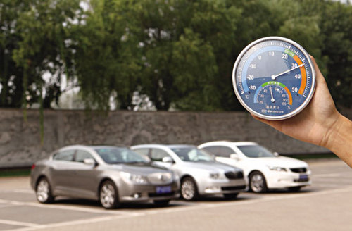 雅阁,因为武装了隔热膜,所以车内温度相对较低,以至于暴晒之后的后排温度显示为39℃,记录数据后,我们起动车辆并将空调系统开至最大风量,以便在5 min后检测空调效果。君越,尽管车身颜色较浅,但高配车型装备的深色玻璃却有助于阻止高温,然而黑色内饰的整体氛围却使得暴晒后的温度数据偏高,达到了42℃。昊锐,车身颜色和内饰颜色均采用浅色调,暴晒后的车内温度为41℃。